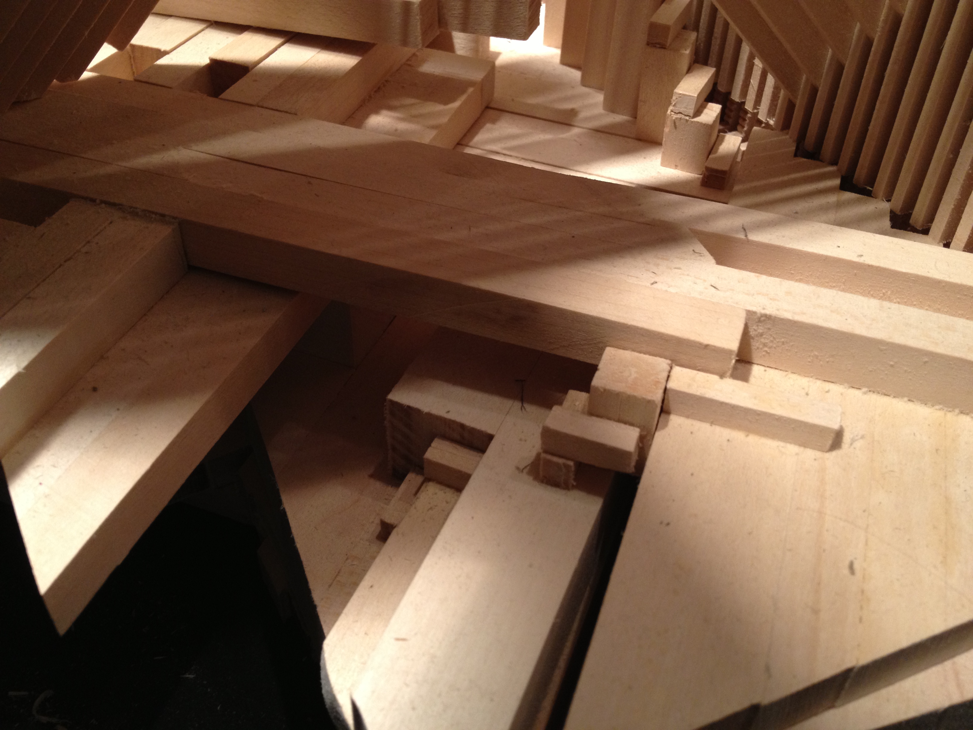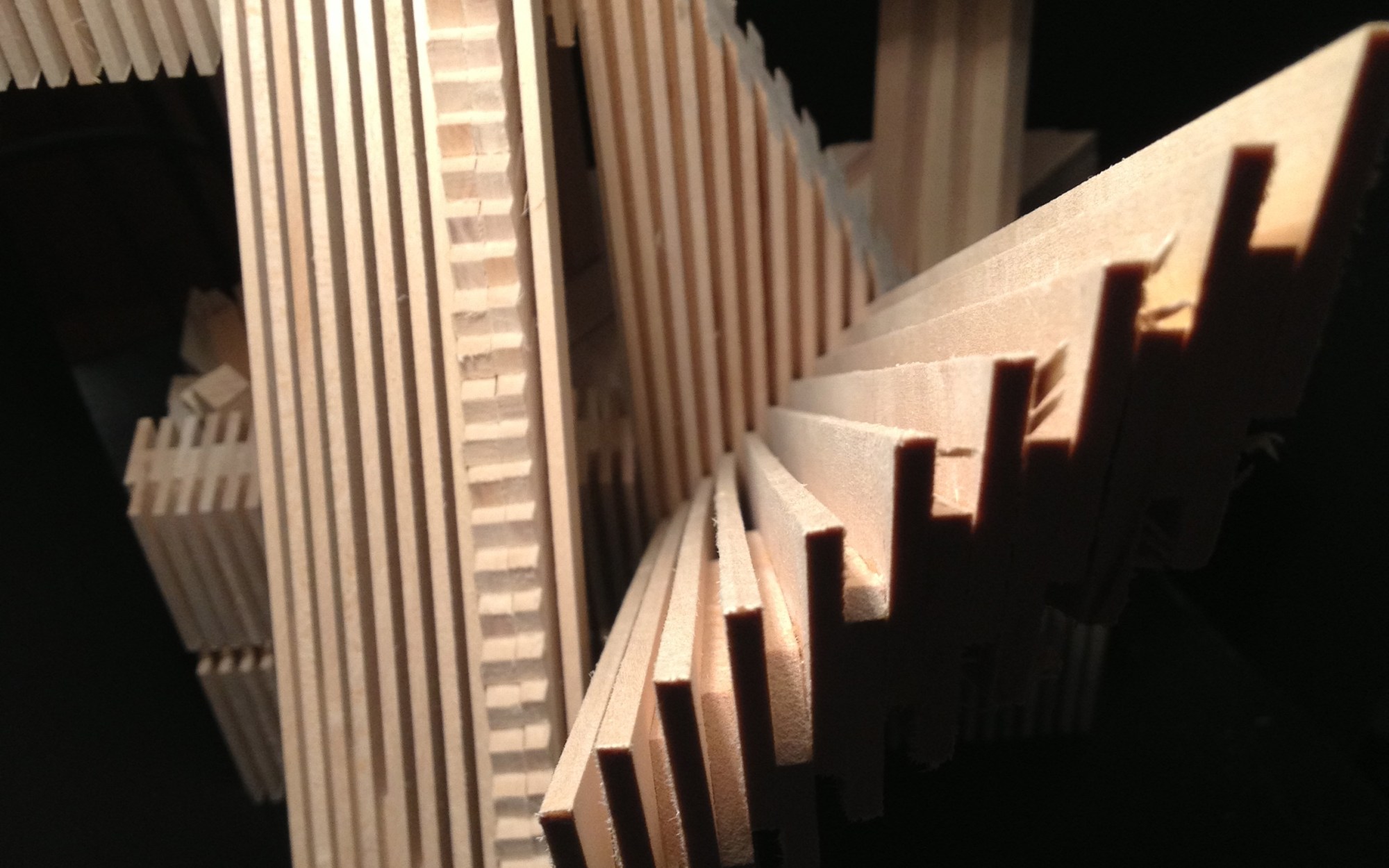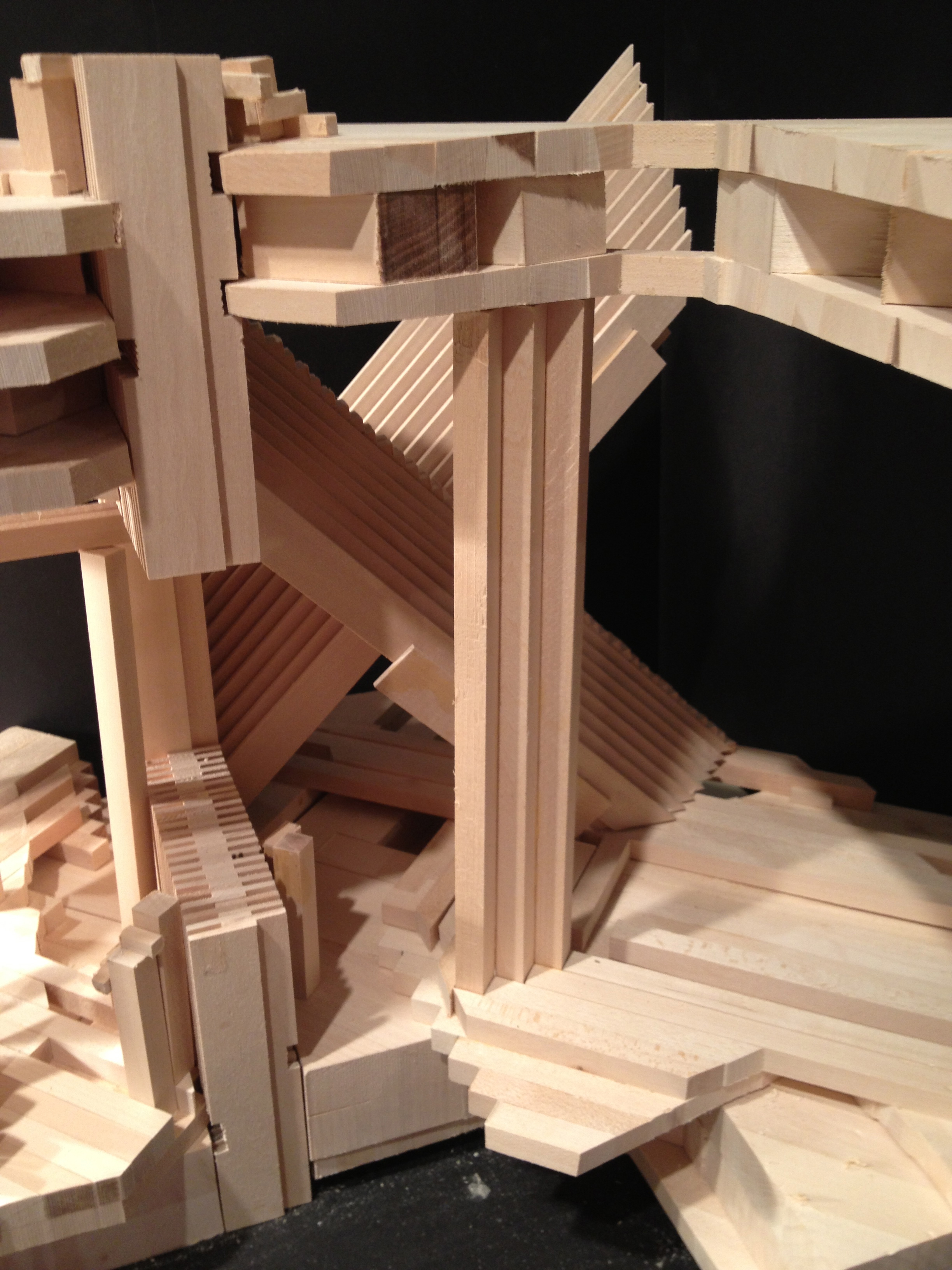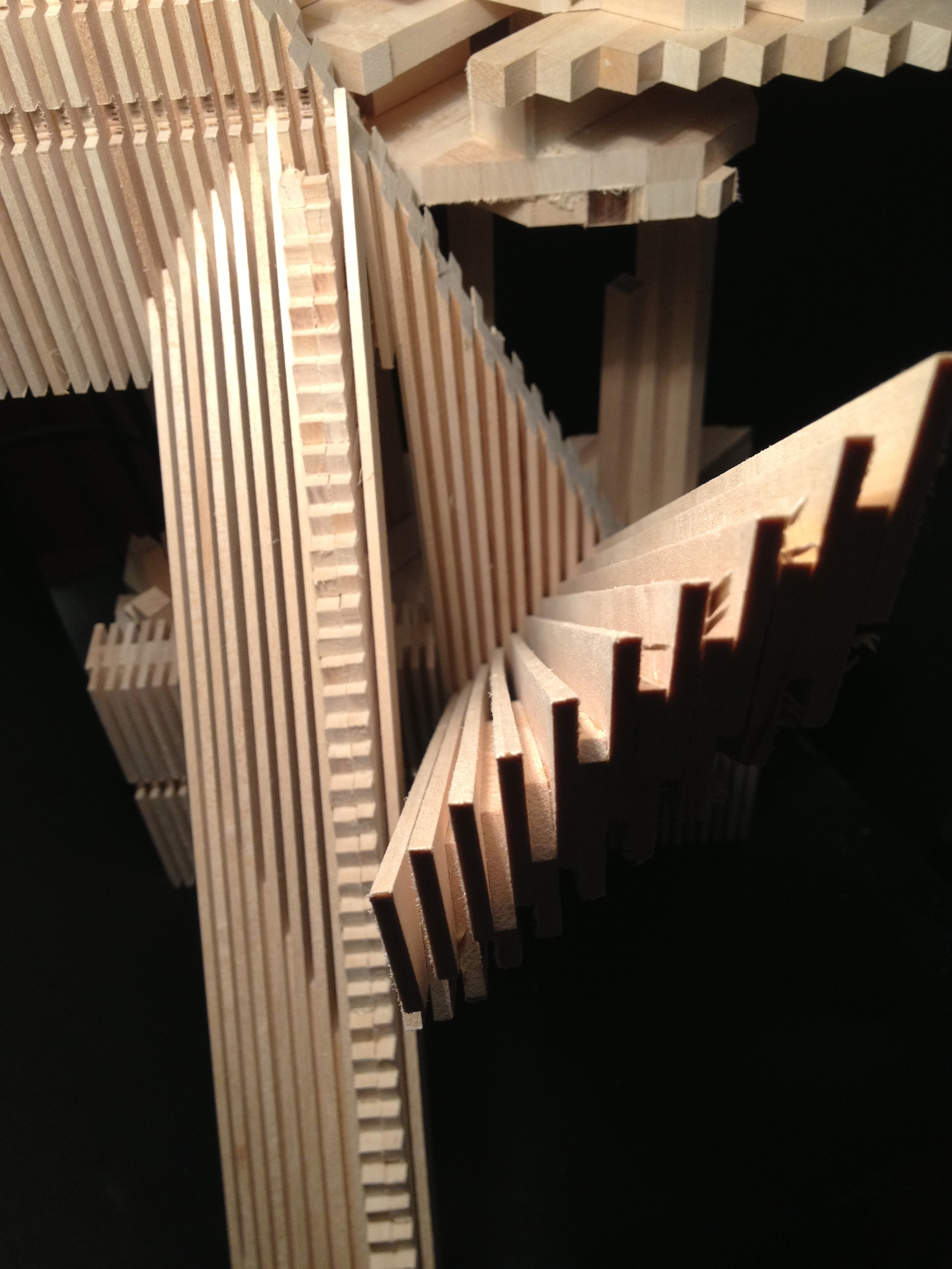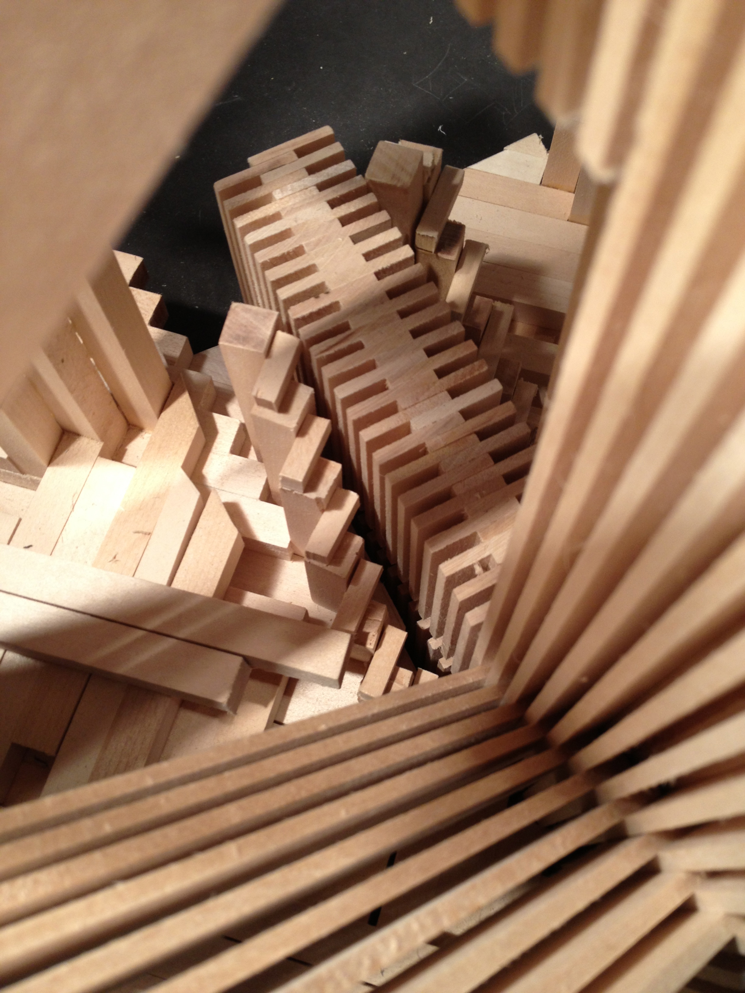 The bottom dense part can be separated into six parts. Those six parts are assembled together by dense lines formingbridges, which hold the assembly on top and on the bottom. The dense lines are so tight that in order to separate the six parts. Those parts should slide parallel to the bridges. The use of joints in the bottom solid block creates those bridges.