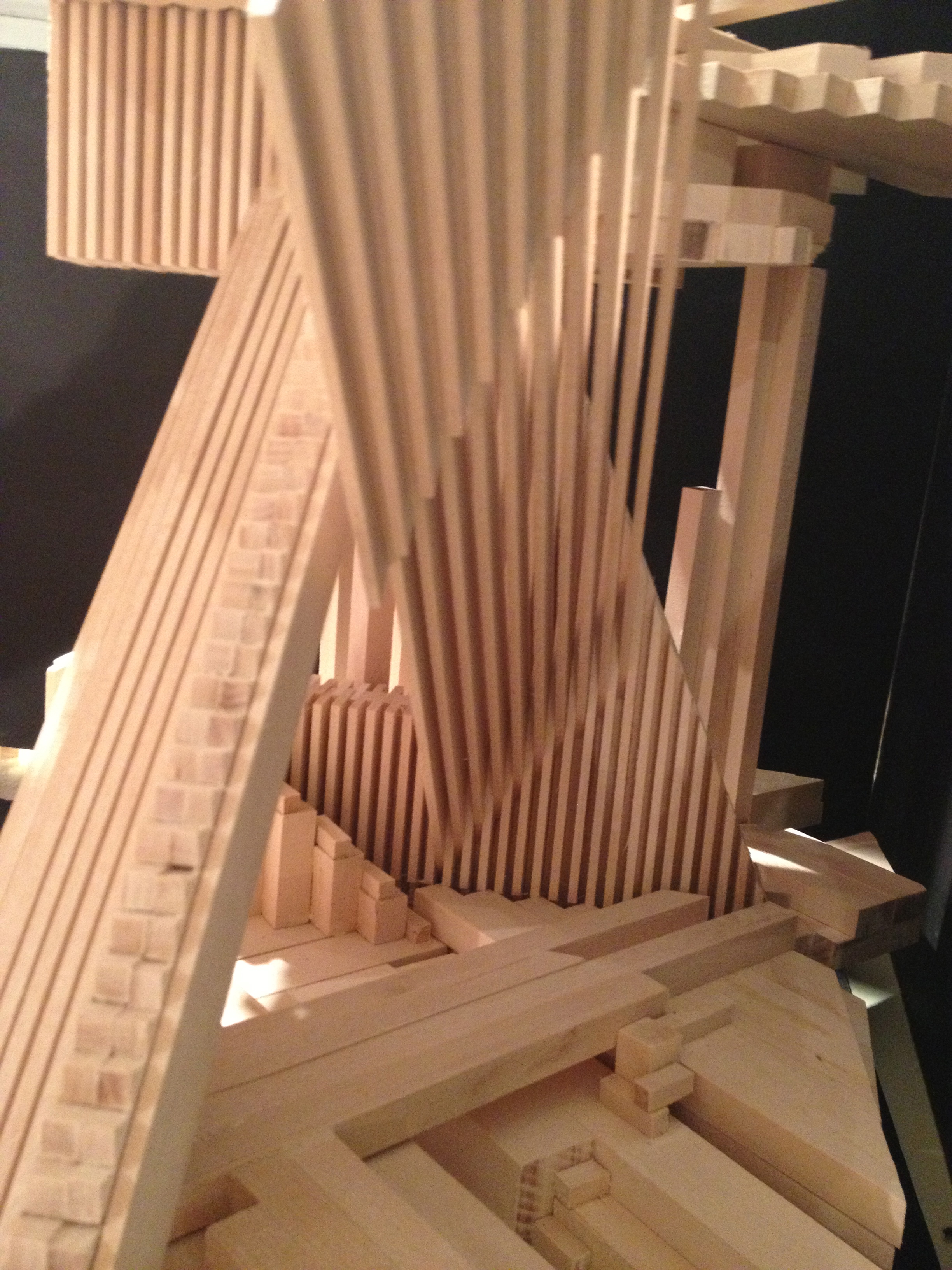 The distance between the floor and the ceiling is enormous creating a sense of freedom. Refraction this time creates another space without turmoil. Refraction can bring about freedom and calmness. The refraction is not only horizontal. Some lines refract and the angle changes forming vertical lines. Those lines go up to the upper block forming columns.