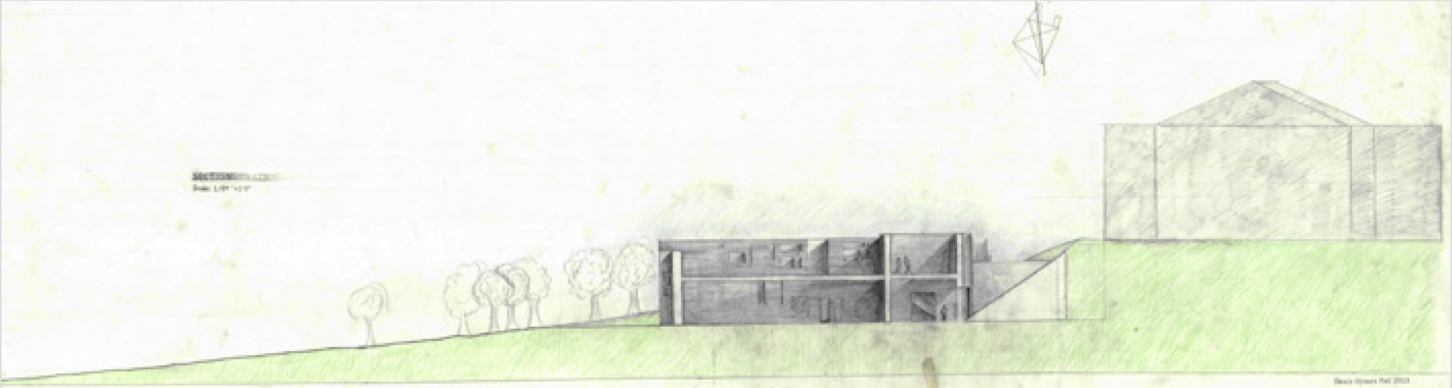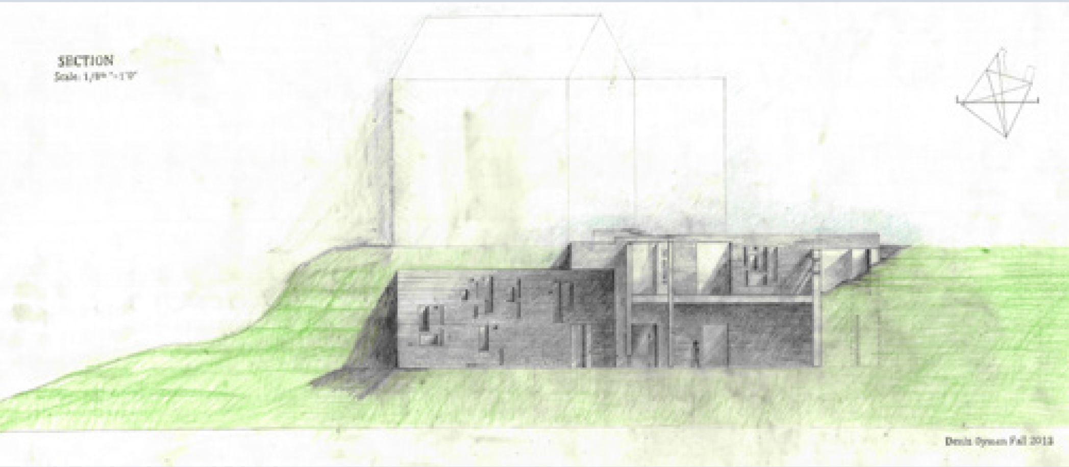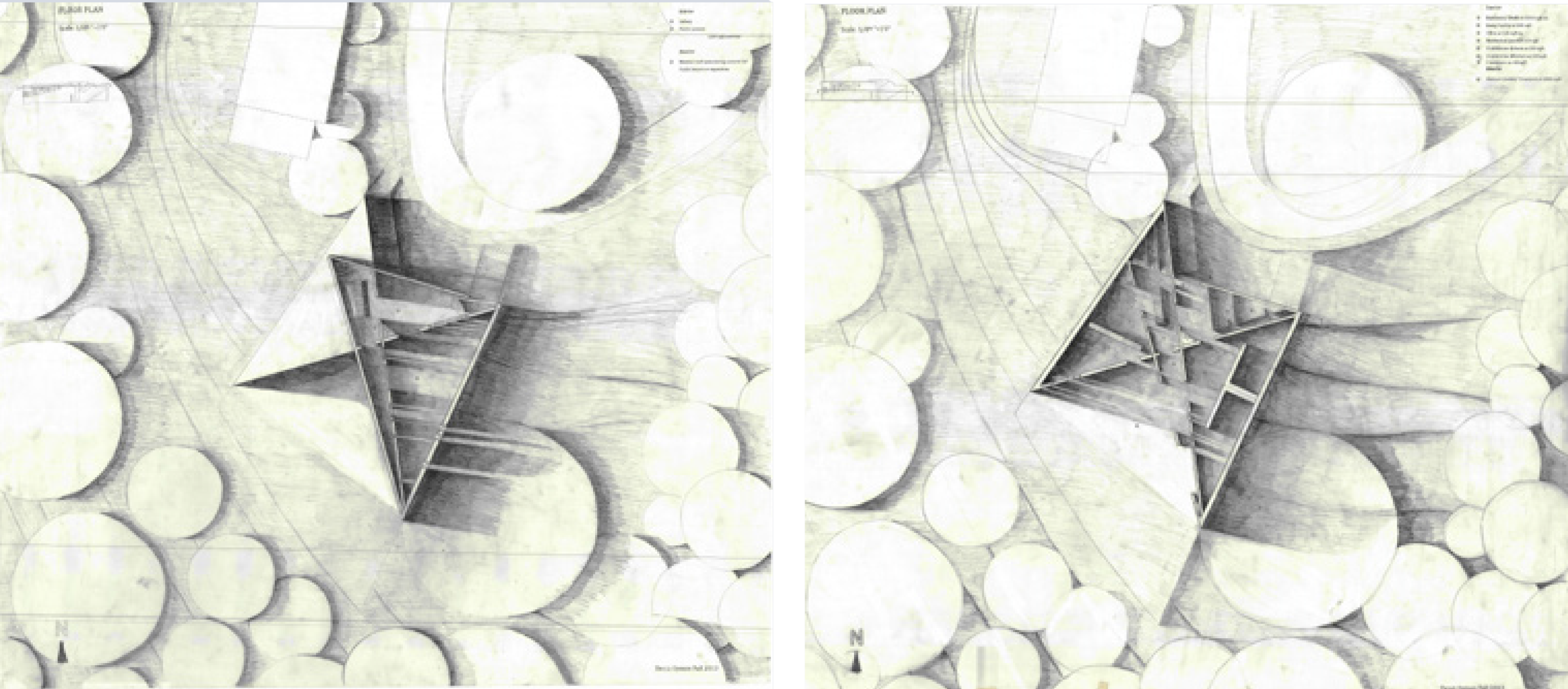 The left hand drawing is at a 1/8”=1’ scale. There is a roof that can be accessed during summer seasons and there can be an open exhibition space. The right hand drawing is at a 1/8”=1’ scale. We can see the different separation of the spaces with a garderobe in the residence and a library in the classroom.